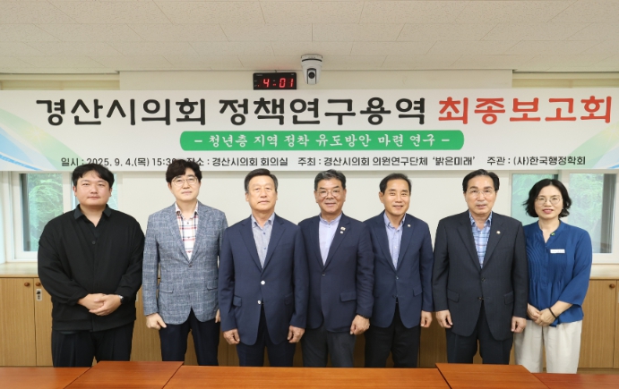 [경북도민방송=이종환 기자]경산시의회 의원연구단체 `밝은미래`는 9월 4일 의회 운영위원회 회의실에서`청년층 지역 정착 유도방안 마련 연구`최종보고회를 가졌다.밝은미래는 양재영, 권중석, 김상호, 전봉근 의원으로 구성되어 있으며, 청년층의 수도권 유출과 지역활력 저하 문제에 대응하고, 경산시에 맞는 생활밀착형 청년 정책을 마련하기 위해 지난 3월 연구용역에 착수했다.이날 보고회에는 소속 의원들과 용역 수행기관 관계자들이 참석한 가운데 진행됐으며, 지난 6개월여간 수행된 연구 결과를 공유하고 정책 대안을 논의하는 자리로 마련됐다.보고회에서는 ▲ 경산시 청년 유출 실태 및 사회‧경제적 영향 분석 ▲ 국내외 청년 정책 우수사례 조사 ▲ 경산형 청년 유입‧정착 모델 및 청년 지구 조성 방안 ▲ 청년친화도시 지정 추진계획 및 조례 정비 방향 등이 중점적으로 발표됐다.특히, 연구진은 “좋은 일자리, 안정된 주거, 풍요로운 문화, 참여 거버넌스라는 4대 축이 유기적으로 맞물릴 때 청년이 머무르고 돌아오는 도시로 나아갈 수 있다.”고 강조했다.밝은미래 의원들은 “이번 최종보고회를 통해 도출된 정책 제안들이 경산시 청년들이 안정적으로 정착하고, 지역 발전의 원동력으로 성장하는 데 실질적으로 기여할 수 있도록 최선을 다하겠다.”고 밝혔다.