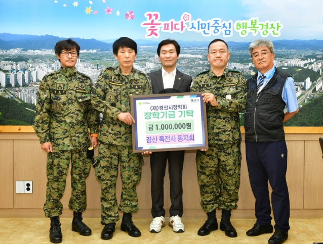 [경북도민방송=이종환 기자](재)경산시장학회(이사장 조현일)는 9일 경산 특전사 동지회 (지회장 김경환)가 지역인재 육성을 위한 장학금 100만 원을 기탁했다고 밝혔다.김경환 지회장은 “회원들이 십시일반 모은 민생 회복 쿠폰으로 장학기금을 마련하게 되어 뜻을 함께 해준 회원들에게 감사하다.”라며, “학생들의 꿈에 대한 도전에 조금이나마 힘이 되기를 바라고 앞으로도 나눔을 이어가겠다.”라고 기탁 소감을 말했다.조현일 이사장은 “경산시 통합방위에 기여함은 물론, 지난해에 이어 올해도 따뜻한 나눔을 해주심에 진심으로 감사드린다”며, “장학기금은 지역 학생들의 학업 증진을 위해 소중히 사용하겠다”고 감사의 인사를 전했다.한편, 경산 특전사 동지회는 지역인재 육성을 위한 경산시장학회 장학기금 기탁과 지역사회 환경개선을 위한 사회봉사, 재난구호 활동 등 사회질서 확립과 안전망 구축에 최우선으로 기여하고 있다.
