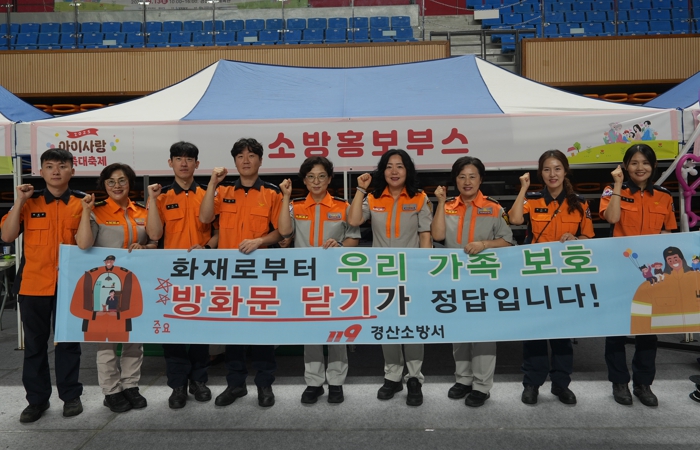 [경북도민방송=이종환 기자]경산소방서는 9월13일 경산실내체육관에서 개최된 ‘아이사랑 가족대축제’ 행사장에서 의용소방대와 합동으로 방화문닫기 캠페인을 실시했다고 밝혔다.이번 캠페인은 추석 연휴를 앞두고 가정에서 발생할 수 있는 불길에 대비하여 시민들의 안전 의식을 높이기 위해 마련됐다. 특히, 아이들이 많은 가족대축제 장소에서 캠페인을 실시함으로써 안전 의식 확산에 더욱 효과를 거두었다.이 외에도 경산소방서는 소화기, 심폐소생술, 하임리히법, 완강기체험 등 홍보부스를 운영하면서 시민들의 안전 의식을 높이는 데 더욱 힘썼다. 경산소방서는 이번 방화문닫기 캠페인을 시작으로, 9월부터 10월까지 관내 다양한 축제장에서 방화문닫기 캠페인을 지속적으로 전개할 계획이다. 특히, 추석 연휴 기간 동안 집중적으로 캠페인을 실시하여 시민들의 안전 의식을 높이고, 가정 내 화재 예방을 위한 안전 문화 확산에 힘쓸 예정이다.한창완 서장은 “이번 방화문닫기 캠페인을 통해 시민들이 화재 예방에 대한 중요성을 다시 한번 인식하고, 가정에서 안전한 생활을 유지하는 데 도움이 되기를 바란다”며, “앞으로도 시민들의 안전을 최우선으로 생각하고, 다양한 안전 교육 및 캠페인을 지속적으로 추진해 나가겠다”고 밝혔다.