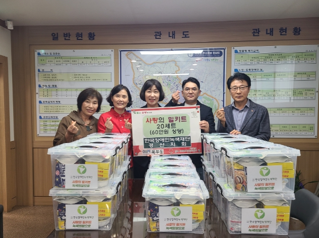 [경북도민방송=이종환 기자]한국장애인녹색재단 경산지회(지회장 최성준)는 15일 북부동행정복지센터를 방문하여 관내 저소득층 20가구에 사랑의 밀키트(60만원 상당)를 기탁했다.“사랑의 밀키트”는 독거 장애인, 어르신 등 식사 준비에 어려움을 겪는 가정을 위한 라면, 햇반 등으로 구성된 식료품 꾸러미이다.최성준 지회장은 “추석 명절을 앞두고 우리 주위에 소외되는 이웃이 없도록 관심을 가지고 도움을 드리고자 회원들이 뜻을 모았으며 앞으로도 지속적인 나눔을 이어가겠다”라고 말했다.김현주 북부동장은 “이웃 사랑 실천을 위해 이렇게 뜻깊은 기부를 해주셔서 감사드리며, 전달해 주신 따뜻한 관심과 사랑이 담긴 꾸러미는 관내 어려운 이웃에게 소중히 전해드리겠다”고 답했다.