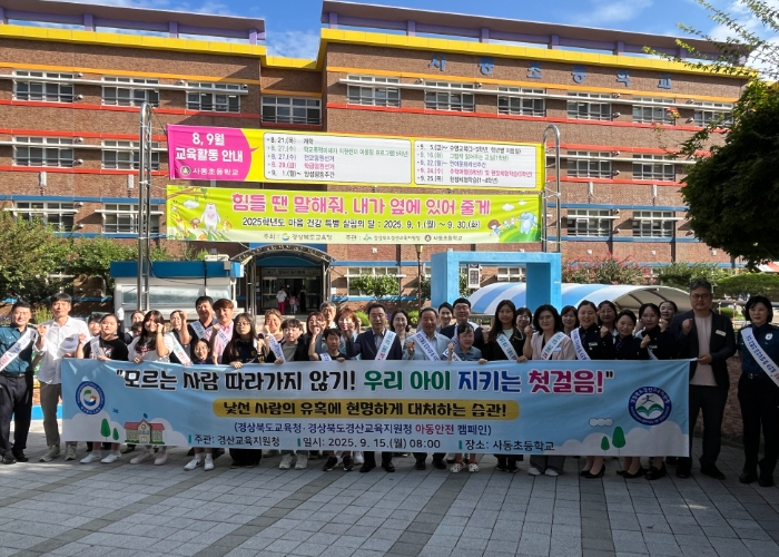 [경북도민방송=이종환 기자]경산교육지원청은 9월 15일 8시부터 사동초등학교에서 최근 초등학교 인근 미성년자 유괴 사건 발생에 따른 유사 범죄를 예방하고, 모든 학생이 안전하고 건강하게 성장할 수 있는 안심 교육 환경을 조성하기 위한 범죄 예방 캠페인을 진행했다. 경상북도경산교육지원청 교육장, 교육지원과장, 장학사, 경산경찰서 학교 담당 SPO 팀, 경산시 녹색어머니회, 학부모회협의회, 학교운영위원장협의회 임원분들과 함께 등교하는 학생 및 학부모들에게 실천하기 쉬운 안전 수칙이 안내된 전단지를 전달했고, 안전 수칙 관련 캠페인 구호를 외치면서 학생 및 학부모들의 유괴 예방 안전 의식 고취 및 적극적인 참여 유도했다. 경산교육지원청 정수권 교육장은“최근 발생한 안타까운 사건은 우리 사회 모두에게 학생 안전의 중요성을 다시 한번 상기시키는 계기가 됐습니다. 이번 캠페인을 통해 우리 학생들이 안심하고 학교에 다니고 즐겁게 뛰어놀 수 있는 안전한 교육 환경을 조성하는 데 최선을 다하겠습니다.”라며, “학교와 가정, 지역사회가 함께 힘을 모아 우리 학생들을 지켜주시기를 간곡히 당부드립니다.”라고 밝혔다.