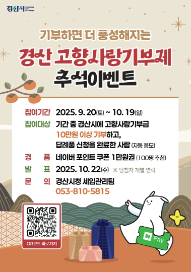 [경북도민방송=이종환 기자]경산시는 민족 최대 명절인 추석을 맞아 ‘경산 고향사랑기부 이벤트’를 진행한다고 18일 밝혔다.이번 이벤트는 오는 9월 20일부터 10월 19일까지 한 달간 열리며, 명절 기간 고향을 찾는 출향인들에게 고향사랑기부제를 홍보하고 참여를 독려하기 위해 기획됐다.대상은 기간 내 경산시에 10만 원 이상 기부하고 답례품을 선택한 기부자다. 기부자 중 100명을 무작위로 추첨해 1만 원 상당의 네이버 포인트 쿠폰을 지급한다.