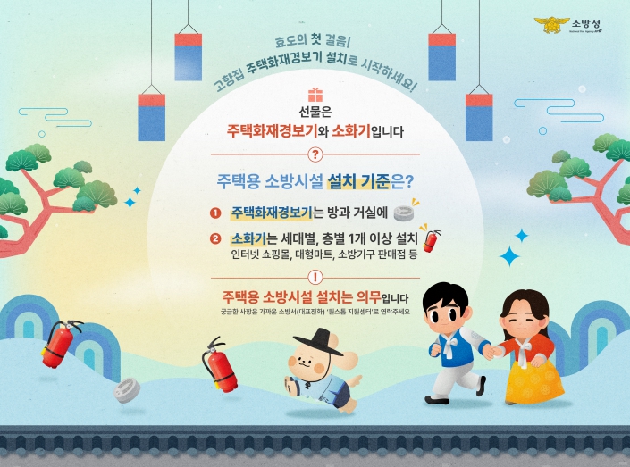 [경북도민방송=이종환 기자]경산소방서는 다가오는 추석 명절을 앞두고 화재 예방과 시민 안전 강화를 위해 9월 26일부터 10월 9일까지 ‘주택용 소방시설 선물하기’ 집중 홍보를 실시한다고 밝혔다.소방청 통계에 따르면 최근 5년간(2020~2024년) 명절 연휴 기간 동안 전국에서 총 2,381건의 화재가 발생했으며, 이로 인해 33명이 사망하고 118명이 부상하는 등 총 151명의 인명피해와 약 199억 8천만 원의 재산피해가 발생했다. 이는 명절 기간 화재의 위험성이 높다는 사실을 보여준다.화재 발생 장소 중 주거시설이 전체의 31.8%를 차지했으며, 그중 단독주택 화재가 57.9%로 가장 높은 비중을 차지했다. 주요 원인으로는 불씨 방치, 음식물 조리 부주의, 전기·가스 취급 부주의 등이 꼽히며, 이는 명절 기간의 일상적인 부주의가 대형 화재로 이어질 수 있음을 시사한다.주택용 소방시설은 단독 및 공동주택에 반드시 설치해야 하는 필수 안전장비로, 세대별·층별로 1대 이상 비치해야 하는 소화기와 각 실마다 설치해야 하는 단독경보형 감지기가 포함된다. 이들 장비는 화재 발생 초기 신속한 경보와 진압을 가능하게 해 인명과 재산 피해를 크게 줄일 수 있다.한창완 경산소방서장은 “주택용 소방시설은 가족과 이웃의 생명을 지키는 가장 확실한 안전장치이자 최고의 명절 선물”이라며 “시민 여러분께서도 소중한 분들께 안전을 선물하는 마음으로 적극 동참해 주시기를 바란다”고 말했다