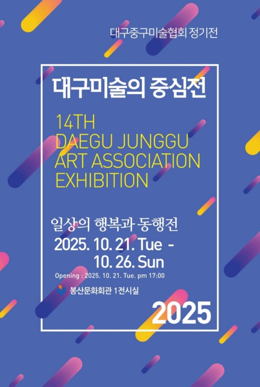 [경북도민방송=손중모 기자]대구 중구는 오는 10월 21일 화요일부터 10월 26일 일요일까지 봉산문화회관 제1전시실에서 ‘2025년 대구미술의 중심展(제14회 중구미술협회전)’을 개최한다고 밝혔다.‘대구미술의 중심展’은 대구 중구미술협회(회장 김영호) 회원들의 미술작품을 전시하는 지역 대표 미술행사로, 2011년경부터 시작되어 올해로 14회를 맞이한다. 주민들에게 아름다운 미술작품 감상의 기회를 무료로 제공하고 지역 작가들에게는 예술 활동을 펼칠 무대가 된다는 점에서 의미가 깊다.중구미술협회에서는 매년 색다른 주제를 중심으로 작품을 전시한다. 지난해에는 ‘자연과 사람’이라는 주제로 55점의 작품이 전시되어 호평을 받은 바 있다. 올해는 ‘일상의 행복과 동행’이라는 주제로 68점의 작품이 전시될 예정으로, 작년에 비해 더욱 다양한 작품 수가 눈에 띈다.류규하 중구청장은 “대구미술의 중심展은 중구의 예술적 역량과 다양성을 뽐내는 대표적인 행사”라며 “깊어가는 가을에 이번 전시를 계기로 차분한 마음과 함께 풍부한 감수성을 충전하시길 바란다”고 말했다.