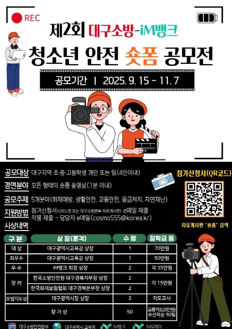 [경북도민방송=손중모 기자] 대구소방본부와 대구광역시교육청이 주최하고 iM뱅크, iM유페이가 후원하는 ‘제2회 대구소방-iM뱅크 청소년 안전 숏폼 공모전’이 오는 11월 7일까지 열린다. 이번 공모전은 청소년이 직접 안전의 중요성을 쉽고 재미있게 표현할 수 있도록 마련된 참여형 콘텐츠 행사로, 대구 지역 초·중·고등학생이면 누구나 개인 또는 4인 이내 팀 단위로 참가할 수 있다.공모 주제는 ▲화재예방 ▲생활안전 ▲교통안전 ▲응급처치 ▲자연재난 등 다섯 가지 분야이며, 1분 이내의 짧은 영상(숏폼)으로 제작해 출품하면 된다.접수는 오는 11월 7일 오후 6시까지이며, 자세한 내용은 대구소방안전본부 누리집에서 확인할 수 있다.시상은 총 10점, 총상금 500만 원 규모로 진행된다. ▲대상·최우수상(대구광역시교육감상, 장학금 70·50만 원) ▲우수상(iM뱅크상, 각 35만 원) ▲장려상(한국소방안전원·한국화재보험협회상, 각 15만 원) ▲모범지도상(대구광역시장 상) 등이 수여된다. 또한 선착순 50팀에게는 5만 원 상당의 교통카드가 지급된다.응모작은 11월 중 심사를 거쳐 11월 21일 결과가 발표되며, 27일 시상식이 개최될 예정이다. 우수작품은 대구소방안전본부, 대구시교육청, iM뱅크 공식 SNS를 통해 시민들에게 공개되고, 안전문화 홍보 영상으로도 활용될 예정이다.