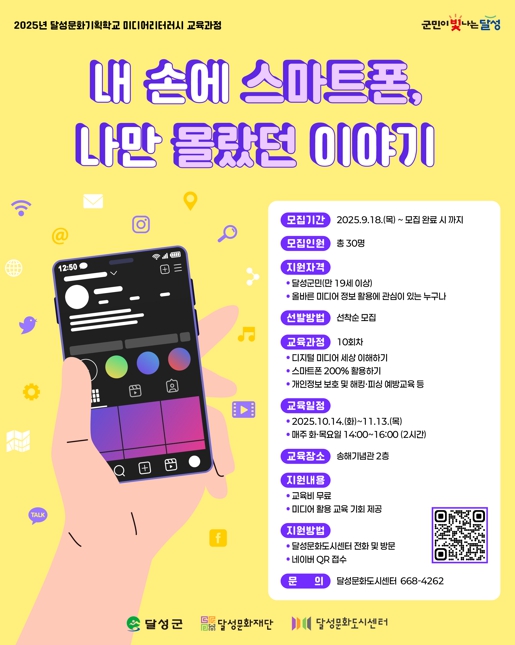 [경북도민방송=손중모 기자](재)달성문화재단 달성문화도시센터는 10월 14일부터 11월 13일까지 선비체험관(송해기념관) 2층에서 ‘미디어리터러시 교육과정 – 내 손에 스마트폰, 나만 몰랐던 이야기’를 진행한다. 이번 교육은 디지털 사회에서 꼭 필요한 ▲스마트폰 활용법 ▲가짜뉴스 판별 ▲개인정보 보호 ▲해킹 및 피싱 예방 등 실생활에 유용한 내용을 중심으로 구성됐다. 단순한 기기 사용법 교육을 넘어 군민들이 디지털 환경에서 능동적으로 살아갈 수 있는 역량을 기르는 것이 이번 교육의 핵심이다. 교육은 매주 화요일과 목요일, 오후 2시부터 2시간 동안 진행되며, 실습 위주로 이루어진다. 미디어 콘텐츠 제작 전문가와 실무 강사진이 참여해 △스마트폰 200% 활용하기 △똑똑한 정보 검색 비법 △누리소통망(SNS)·카카오톡 활용법 △내가 만드는 콘텐츠 등 다양한 프로그램을 선보인다. 센터 측은 이번 교육을 통해 디지털 기기에 익숙하지 않거나 미디어 활용에 자신 없는 군민들이 스마트폰을 적극적으로 배우고, ‘스마트폰 소비자’에서 ‘스마트폰 활용가’로 거듭날 수 있도록 지원할 계획이다. 교육은 19세 이상의 달성군민을 대상으로 하며, 수강 신청은 방문, 전화, 또는 온라인(네이버폼)을 통해 가능하다. 최재훈 이사장은 “이번 교육은 실생활과 밀접한 내용을 중심으로 구성된 만큼, 일상에 바로 적용할 수 있는 실질적인 배움의 장이 될 것”이라며, “많은 군민들께서 관심을 갖고 참여해 주시길 바라며, 앞으로도 군민 눈높이에 맞는 다양한 디지털 역량 강화 프로그램을 꾸준히 마련하겠다”고 말했다.