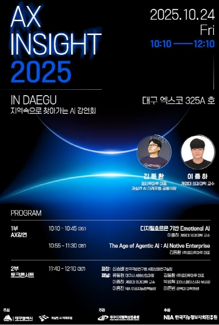 [경북도민방송=손중모 기자] 대구광역시는 (사)과실연 AI미래포럼과 함께 10월 24일(금) 대구 엑스코에서 ‘AX·Security Insight 2025 In Daegu’를 개최한다.이번 행사는 ‘2025 미래혁신기술박람회(FIX 2025)’의 주요 컨퍼런스 중 하나로, ‘AI 전환과 정보보호 대응전략’을 주제로 열린다. 인공지능(AI)과 정보보호 분야의 최신 트렌드와 정책 방향을 공유하고, 지역 산업의 AI 전환 촉진과 사이버보안 대응력 강화를 위한 협력 방안을 모색한다. 1부 : AX 세션첫 번째 세션에서는 AI 기술 진화와 산업 적용 사례를 중심으로 강연이 진행된다. 이종하 계명대학교 의과대학 교수가 ‘디지털휴먼으로 구현되는 Emotional AI’를 주제로 인간 감성과 공감 능력 기반의 AI 발전 방향을 제시한다.이어 김동환 ㈜포티투마루 대표가 ‘The Age of Agentic AI : AI Native Enterprise’ 강연을 통해 차세대 AI 에이전트 기술과 기업 혁신 전략을 소개한다.토크콘서트에서는 ‘인공지능 대전환 시대, 대구의 미래 전략과 지역 맞춤형 AI 해법’을 주제로 심승배 한국국방연구원 실장, 이용진 한국지능정보화사회진흥원 실장, 이종하 계명대 교수가 패널로 참여해 AI 대전환 시대에 대응한 지역 산업 생태계 전략을 심도 있게 논의한다. 2부 : 정보보호 세션오후에는 정보보호·사이버보안 분야 세션이 이어진다. 윤두식 ㈜이로온앤컴퍼니 대표가 ‘LLM 보안이슈와 융합 방안’을 주제로 AI 보안 위협 대응 전략을 발표하고, 김의탁 ㈜티씨브이 대표가 ‘AI 정보보호 및 사이버 침해 대응 방안’에 대해 강연한다.이어 중앙전파관리소의 ‘CISO 지정신고제도 및 대경 CISO 협의회’ 소개와 강주영 한국정보보호산업협회 부원장의 정보보호 교육사업 소개, 김연석 한국전력기술 실장의 정보보호 우수사례 발표가 이어진다.마지막으로 서미숙 ㈜에스에스엠씨 대표가 ‘중소기업 CISO의 역할과 전략: 생존을 넘어 성장으로’를 주제로 발표하며, 컨퍼런스의 대미를 장식한다.대구시는 이번 행사를 통해 지역 AI 생태계와 정보보호 산업 간 연계 강화를 위한 협력 기반을 공고히 다지고, 향후 ‘AI·보안 융합도시 대구’ 실현을 위한 발판을 마련할 계획이다.류동현 대구시 ABB산업과장은 “AI 전환과 보안 대응은 지역 산업의 미래 경쟁력을 좌우하는 핵심 과제”라며, “이번 컨퍼런스에서 논의된 아이디어와 제안을 정책에 적극 반영해 대구가 AI와 보안이 융합된 혁신 거점도시로 성장할 수 있도록 최선을 다하겠다”고 말했다.한편, 대구시와 (사)과실연 AI미래포럼은 지난해에 이어 2년 연속으로 컨퍼런스를 공동 개최하며, 지역 AI 생태계 활성화를 위한 네트워크 구축과 협력 사업을 지속 추진하고 있다.