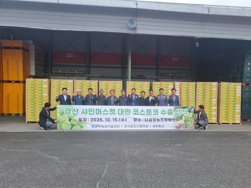 [경북도민방송=이종환기자] 경산시가 지역 대표 농특산물인 샤인머스캣의 해외 수출 확대에 나섰다.시는 15일 다금영농조합법인에서 양재영 시의원, 이성관 압량농협장, 하주골 포도영농조합회원 등 관계자 50여 명이 참석한 가운데 대만 수출 선적식을 개최했다.이번 선적분은 2kg 포장 6,600박스(총 13톤) 규모로, 대만 코스트코 매장에 공급된다.