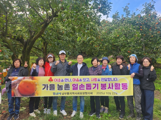 [경북도민방송=이종환 기자]경산시 남부동지역사회보장협의체(공동위원장 정성극)는 22일 청도읍에 위치한 ‘사랑 나눔 농장’에서 봉사활동으로 감을 수확하여 이웃사랑 실천에 앞장섰다. 이날 사랑나눔농장은 남부동지역사회보장협의체 석길복 위원의 감밭에서 이루어졌으며, 협의체 위원들은 이른 아침부터 모여 총 18박스(5kg)의 감을 수확했으며 관내 경로당 18곳에 전달했다. 정성극 공동위원장은 “감을 수확하며 몸은 힘들었지만 위원님들과 나눔의 가치를 실천할 수 있었던 뜻깊은 경험이었으며, 앞으로도 소외된 이웃을 위해 다양한 사업을 추진하겠다”고 전했다. 이상철 남부동장은 “이웃을 위하는 마음과 정성으로 감 수확에 동참 해 주신 위원님들의 노고에 깊은 감사를 드리며, 남부동의‘사랑나눔 농장’이 지역사회 내 나눔문화 확산에 기여할 수 있도록 지속적인 관심과 지원을 아끼지 않겠다”고 전했다.한편, 남부동지역사회보장협의체에서는 2023년부터‘사랑나눔 농장’을 운영하여 직접 심고 길러 수확한 농작물(감자, 복숭아 등)을 돌봄이 필요한 이웃들에게 나눔으로써 이웃들에게 따뜻한 손길을 전하고 있다.