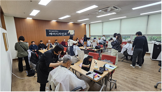 [경북도민방송=손중모기자] 대구공업대학교 헤어디자인과 학생들이 지난 22일 달서구노인종합복지관에서 지역 어르신들을 대상으로 헤어커트와 스타일링 봉사활동을 진행했다.이날 봉사는 전공 실습을 넘어 학생들이 지역사회의 일원으로서 직업적 자긍심과 봉사의 가치를 함께 배우기 위해 마련됐다.