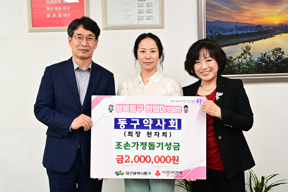 [경북도민방송=손중모기자] 대구 동구약사회는 지난 24일 동구청을 방문해 어려운 형편의 조손가정을 돕기 위한 성금 200만원을 전달했다.천자희 회장은 “도움이 필요한 조손가정에 작은 힘이 되기를 바란다”며“앞으로도 약사회 차원에서 지역사회와 함께하는 나눔을 꾸준히 이어가겠다”고 말했다.윤석준 동구청장은 “꾸준히 지역사회를 위해 나눔을 실천해 주신 동구약사회에 깊이 감사드린다”며“기탁된 성금은 조손가정의 생활 안정을 위해 소중히 사용하겠다”고 밝혔다.한편 동구약사회는 매년 지역 내 소외계층을 대상으로 의약품 및 성금 지원 활동을 지속적으로 이어오고 있다.