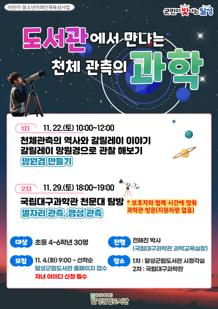 이번 프로그램은 과학에 대한 호기심을 자극하고 가족 단위로 함께 체험할 수 있는 교육의 장을 마련하기 위해 기획됐다.4분기 주제는 ‘천체 관측의 과학’으로, 초등학생과 가족들이 별과 행성을 직접 관찰하며 우주의 신비를 배우는 체험형 과학 교육으로 구성됐다.1차 수업은 11월 22일 달성군립도서관 시청각실에서 ‘천체관측의 역사와 갈릴레이 이야기’를 주제로 진행된다.