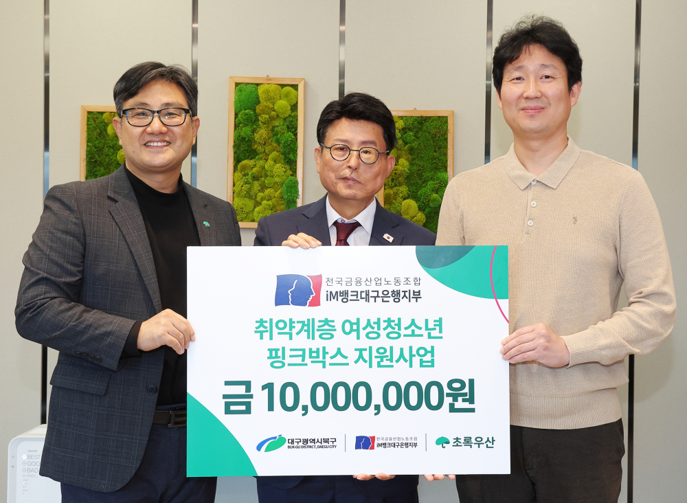 후원금으로 마련된 물품은 대구시 북구청을 통해 지역 내 취약계층 아동·청소년 60명에게 전달될 예정이다.이날 전달식에는 배광식 대구 북구청장, 백지노 iM뱅크대구은행지부 위원장, 문희영 초록우산 어린이재단 대경권역총괄지역본부장 등이 참석해 나눔의 의미를 더했다.배광식 북구청장은 “경제적 어려움으로 기본적인 위생용품조차 구비하기 힘든 청소년들에게 큰 도움이 될 것”이라며 “iM뱅크 임직원들의 따뜻한 나눔과 사회적 책임 실천에 감사드린다”고 말했다.백지노 위원장은 “이번 핑크박스 지원은 임직원들의 급여 1% 나눔으로 마련된 뜻깊은 기금으로, 도움이 필요한 청소년들에게 실질적인 보탬이 되길 바란다”며 “앞으로도 지역 아동과 청소년의 복지 향상, 건강한 성장 환경 조성을 위한 사회공헌활동을 지속적으로 이어가겠다”고 밝혔다.한편 iM뱅크대구은행지부는 김장 나눔, 산불 피해 복구 지원, 소규모 초등학교 지원, 환경교육 캠페인 등 다양한 사회공헌활동을 펼치며, 지역사회에 받은 사랑을 나눔으로 실천하고 있다.