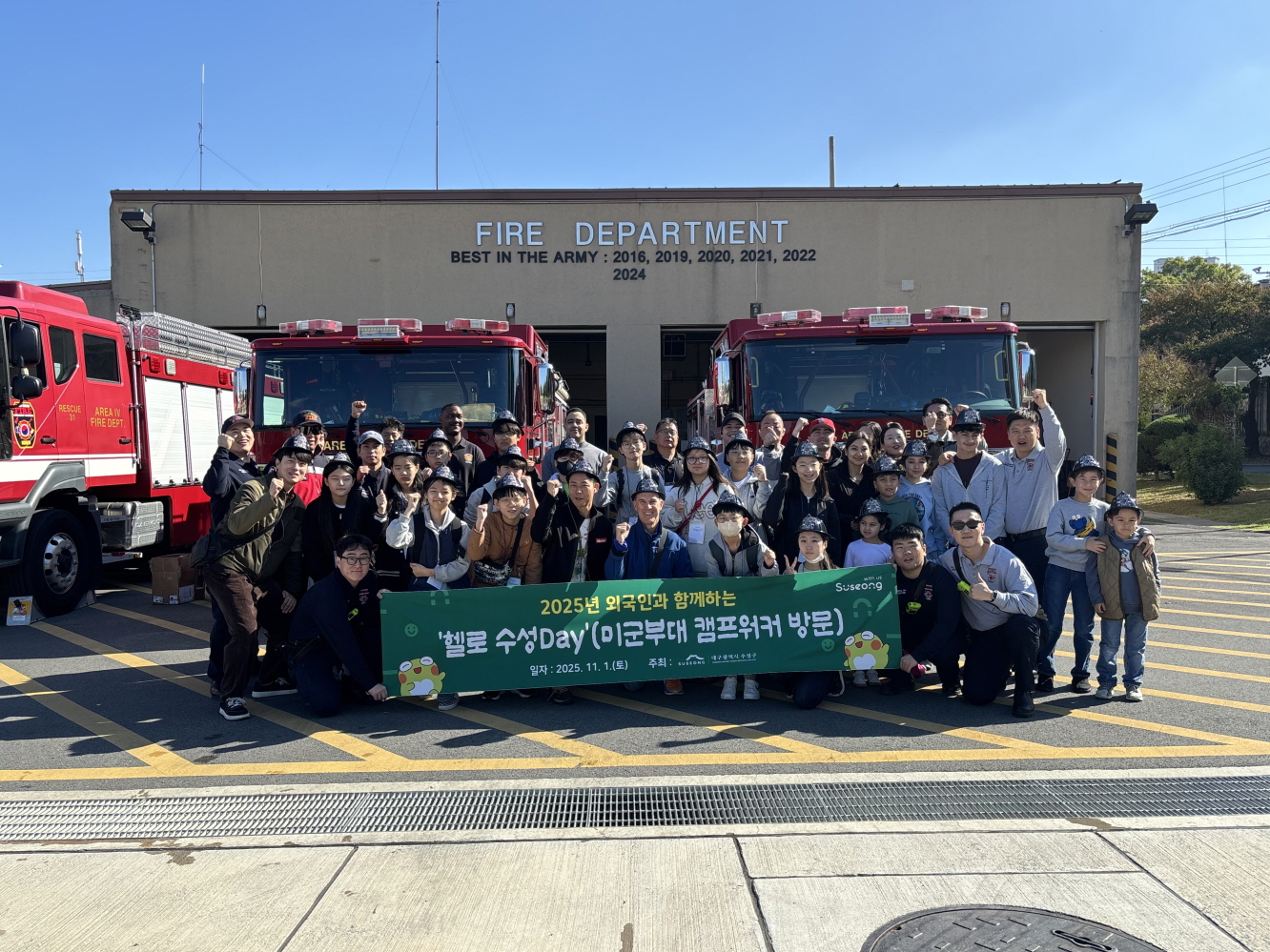 [경북도민방송=손중모기자] 대구 수성구는 지난 1일 미군부대 캠프워커(Camp Walker)에서 ‘2025년 외국인과 함께하는 헬로 수성Day’ 1회차 행사를 성황리에 개최했다고 밝혔다.이번 행사는 관내 초등학생 14명을 비롯해 미군부대 장병과 학생들이 함께 참여한 국제문화 교류 프로그램으로, 양 지역 사회의 우호와 상호이해 증진을 위해 마련됐다.참가자들은 부대 내 소방서를 견학하며 미군의 선진 소방 시스템과 안전문화를 배우고, 이어 볼링 등 다양한 실내 활동을 통해 교류의 시간을 가졌다.
