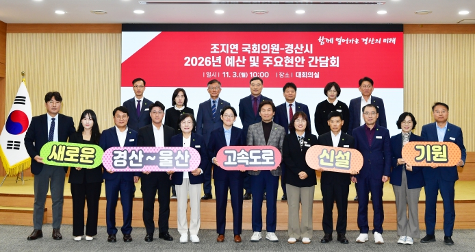 [경북도민방송=이종환 기자]경산시는 3일 시청 대회의실에서 조지연 국회의원과 간담회를 개최하고, 2026년 정부 예산 확보 및 주요 시정 현안 사업에 대한 긴밀한 협력 방안을 논의했다.이번 간담회는 시민 삶의 질 향상과 지역 균형발전을 위한 핵심사업을 공유하고, 국회와 중앙부처 예산 심의 단계에서 실질적인 반영을 이끌어 내기 위한 긴밀한 협력 체계를 구축하는 데 초점을 두었다. 이번 간담회에서는 △임당유니콘파크 조성, △현대프리미엄아웃렛 추진 현황, △자인노인복지관 건립, △대구 도시철도 1,2호선 순환선 구축, △하·폐수처리시설 지하화 사업 등 현재 추진 중인 주요 사업에 대해 설명하고 협력 사항에 대한 심도 있는 논의가 이뤄졌다. 또한, 올해 정부 예산안에 미반영된 13개 사업(총 481억 원)의 국비 추가 확보 방안을 논의하고 해당 사업들이 국회 심의 과정에서 반영될 수 있도록 조지연 국회의원의 적극적인 지원을 요청했다.조지연 국회의원은 ˝오늘 논의된 현안 사업들이 경산 발전의 마중물이 될 것으로 기대한다”며 ”주요 사업들이 차질 없이 진행될 수 있도록 국회 예산 심의 과정에서 끝까지 챙기겠다”고 말했다.조현일 경산시장은 “정부 예산 확보에 최선을 다해주시는 국회의원께 감사하다”며 “시민들이 체감하고 지역발전을 선도할 수 있는 사업들이 차질 없이 추진될 수 있도록 총력을 다하겠다”고 말했다.