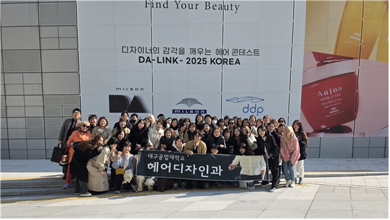 [경북도민방송=손중모기자] 대구공업대학교 헤어디자인과 1~2학년 학생 50여 명이 지난 4일 서울 동대문디자인플라자(DDP) 아트홀 1관에서 열린 ‘밀본 DA-LINK 2025’ 행사에 참석해 실무 중심의 최신 헤어 트렌드를 직접 체험하는 뜻깊은 시간을 가졌다.‘밀본 DA-LINK 2025’는 글로벌 헤어브랜드 밀본이 주최하는 대표적인 뷰티 크리에이티브 쇼로, ‘디자이너의 감각을 깨우는 헤어 콘테스트’를 주제로 개최됐다.