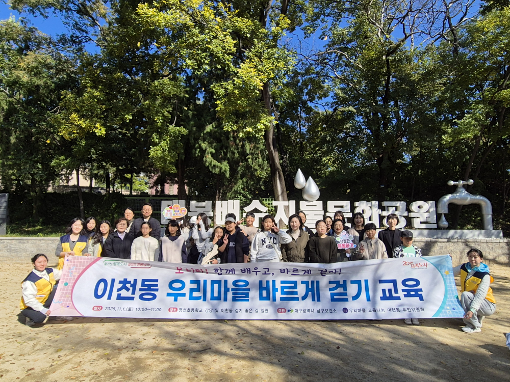 이어 2부에서는 ‘건강한 이천동 만들기 플로깅’ 활동이 이어져, ‘시간 풍경 골목길’에서 ‘고미술거리’까지 걷는 구간을 따라 쓰레기를 줍는 거리정화활동과 사진 인증 미션이 함께 진행됐다.특히 참가한 청소년과 가족들은 대봉배수지 물문화공원, 서봉사, 이천동 99계단, 고미술거리 등 이천동의 주요 명소를 걸으며 지역의 역사와 자연을 체험하는 뜻깊은 시간을 보냈다.이날 행사에 참석한 성윤희 대구 남구의회 의원은 “이천동의 풍부한 문화자원을 활용한 테마거리를 바른 자세로 걸으며 건강도 챙기고 지역의 역사도 배우는 소중한 기회가 되길 바란다”고 말했다.이명자 남구보건소장은 “이번 교육은 주민과 함께하는 마을 단위 걷기 문화 확산의 좋은 계기가 됐다”며“앞으로도 지역 특성을 살린 건강걷기 프로그램을 지속 추진해 주민의 건강 증진과 생활 속 운동 문화 정착에 힘쓰겠다”고 밝혔다.