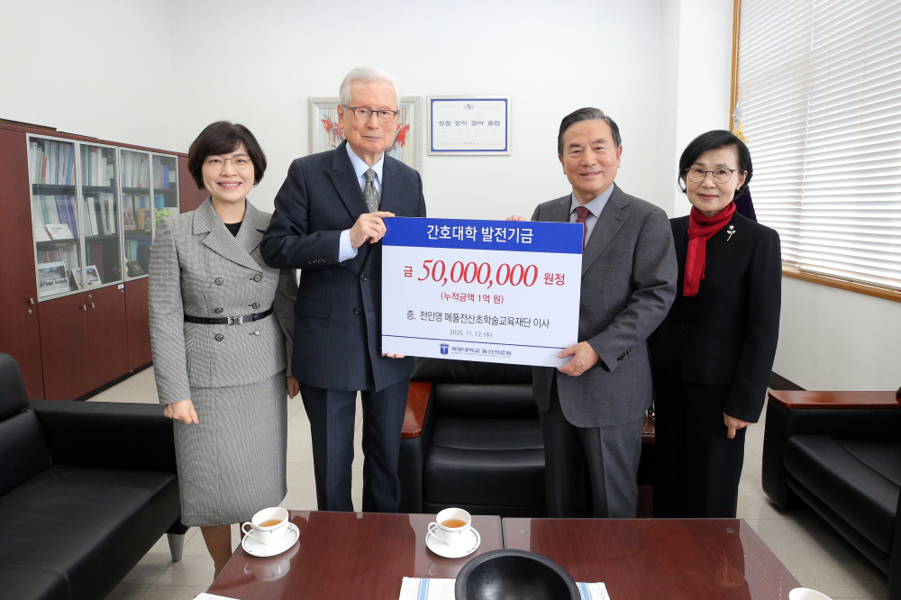 전 이사는 이날 간호대학 발전기금 5천만 원을 추가 기탁해 총 1억 원을 후원했다.메풀재단은 매년 ‘메풀 전산초 박사 기념 전국 간호대학생 학술대회’를 후원하며 간호교육 기반 확장에 기여하고 있다.메풀 전산초 박사(1921~1999)는 ‘한국 간호학의 어머니’로 불리는 인물로, 전인간호 개념을 정립한 철학자이자 교육자다.