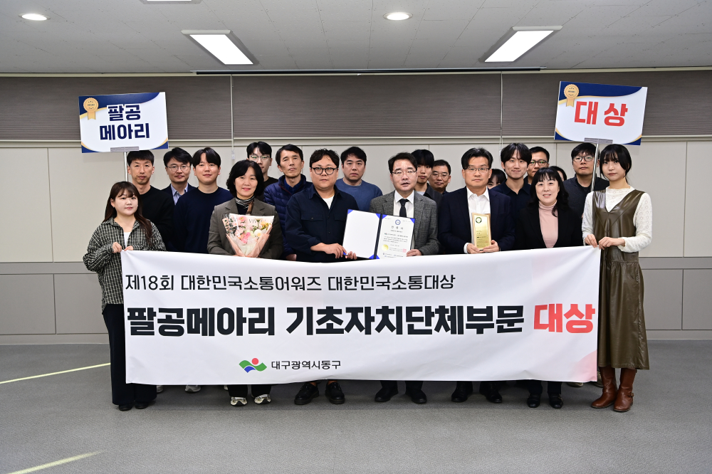 [경북도민방송=손중모기자] 대구 동구의 구정소식지 ‘팔공메아리’가 지난 13일 열린 제18회 대한민국소통어워즈에서 대한민국소통대상 부문 기초자치단체 대상을 수상했다.대한민국소통어워즈는 한국인터넷소통협회가 주관하고 과학기술정보통신부, 산업통상자원부 등이 후원하는 시상식으로, 고객·시민과의 소통 성과가 뛰어난 기관과 기업을 선정해 시상한다.동구 소식지 ‘팔공메아리’는 어린이 신문 창간, 어르신 전용 ‘팔공메아리 큰 책’ 발행 등 전 세대를 대상으로 한 맞춤형 소식지로서의 변화가 높은 평가를 받았다.
