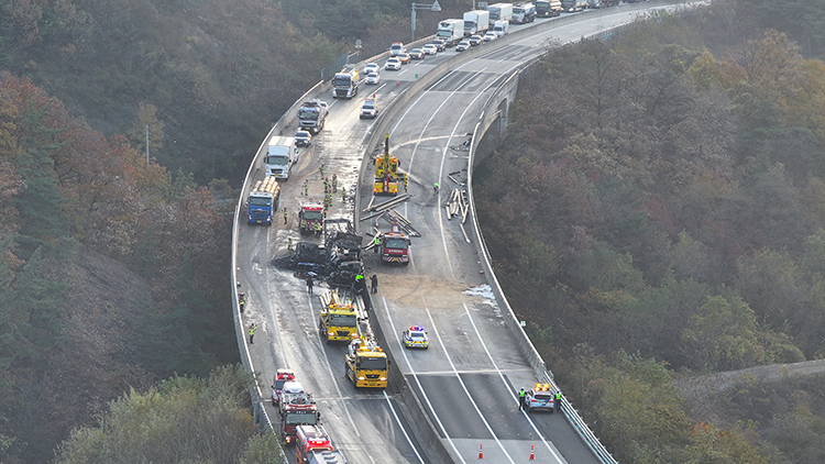불길은 2시간 넘게 이어졌고, 양방향 통행은 5시간 넘게 묶였다.사고는 17일 오전 3시 12분께 영천시 신녕면 화남리 신녕IC 인근 63.7㎞ 지점에서 발생했다.