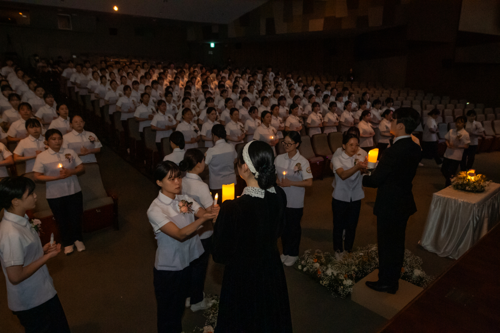 두 학생은 후배들에게 간호정신을 상징하는 촛불을 전달하며 선서식의 의미를 더했다. 촛불을 이어받은 2학년 학생들은 엄숙한 분위기 속에서 “타인을 위해 사랑과 봉사로 헌신하는 전문 의료인이 되겠다”고 선서했다.간호대학 동문회는 후배들을 격려하기 위해 ‘DHC 간호꿈나무 장학생’으로 선발된 2학년 김유경, 우나경 학생에게 장학금을 수여했다. 이어 초청 성악가의 축하 공연과 교가 제창으로 행사가 마무리됐다.남성희 총장은 “오늘의 선서는 생명과 존엄을 지키겠다는 마음의 약속이자, 고통받는 이웃을 돕겠다는 헌신의 다짐”이라며 “전문성과 따뜻한 인성을 갖춘 간호인으로 성장해 사회를 밝히는 등불이 되길 바란다”고 격려했다.