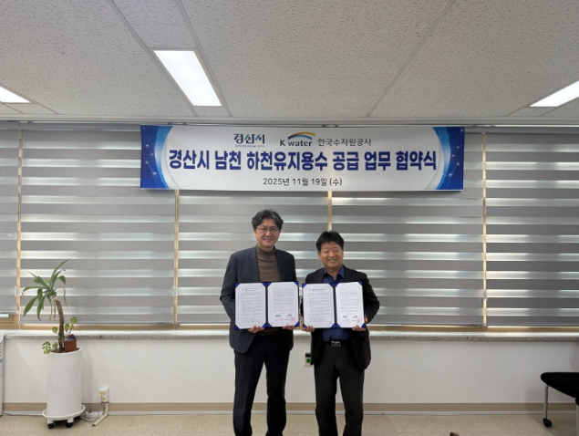 [경북도민방송=이종환 기자]경산시는 19일 맑은 물 사업본부에서 한국수자원공사 운문권 지사와‘남천 하천유지용수(환경 개선 용수) 공급’을 위한 업무협약을 체결했다고 밝혔다.이번 협약은 경산시에서 추진 중인 도심 하천을 특색있는 수변환경으로 정비하는‘남천 자연생태하천 조성 사업’의 일환으로 마련됐으며, 시 중심지를 관류하는 남천(지방하천)이 평상시 유량 부족으로 건천화가 심화되고, 이를 해소하기 위해 하수재이용수를 송수함에 따라 발생하는 악취 우려에 대한 근본적인 원인 해결을 목적으로 한다.경산시는 이번 협약을 통해 대정동에 위치한 수자원공사의 기존 하천 원수 취수·공급시설을 활용할 수 있게 되고, 안정적이고 풍부한 수원 확보가 가능해져 남천의 건천화를 해소하고 건강한 수생태 환경 및 친수공간을 조성할 수 있을 것으로 기대된다.또한, 양 기관은 안정적 물 공급을 위한 구체적인 협력체계를 구축하여, 가뭄·홍수 등 자연재해에 대비한 안정적 물 관리를 위해 노력할 계획이다.조현일 경산시장은 “하천유지용수의 추가적인 공급으로 건강한 수생태 환경이 회복되고, 자연과 사람이 함께하는 자연 친화적인 남천이 조성 될 것”이라며 “앞으로도 양 기관의 긴밀한 협력을 통한 시민들이 쾌적한 수변환경을 즐길 수 있도록 최선을 다하겠다”고 말했다.