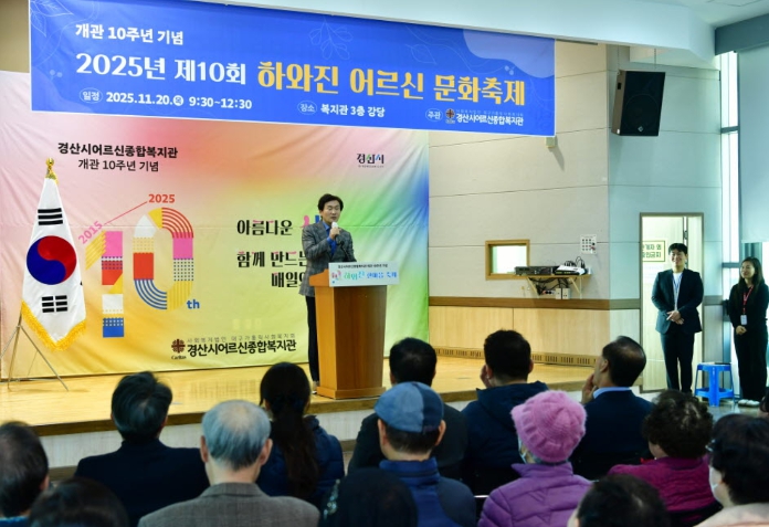 [경북도민방송=이종환 기자]경산시어르신종합복지관은 20일 경산시 어르신종합복지관 3층 강당에서 회원 및 행사 관계자 300여 명이 참석한 가운데 “제10회 하와진 어르신 문화축제”를 성황리에 개최했다.이번 축제는 어르신들이 1년 동안 다양한 프로그램을 통해 갈고닦은 예술적 역량을 선보이는 종강 발표회와 직접 만든 작품을 전시하는 작품전시회로 꾸며져 풍성한 볼거리를 제공했다.종강 발표회에서는 난타, 사물놀이, 아코디언, 하모니카, 기타, 댄스스포츠 등 8개 팀이 무대에 올라 그동안의 노력이 담긴 수준 높은 공연을 선보였으며, 작품전시회에서는 서예, 캘리그라피, 유화, 민화 등 70여 점의 작품이 전시되어 어르신들의 창작 열정을 한눈에 살펴볼 수 있었다.이번 문화축제는 어르신들이 주인공이 되어 그간의 열정과 노력이 담긴 공연과 작품을 공유함으로써 자긍심과 성취감을 높이는 뜻깊은 시간이 됐으며, 무엇보다 어르신 복지 향상에 헌신한 모범 어르신과 노인복지 기여자에 대한 표창 수여식도 함께 진행되어 축제의 의미를 더했다.경산시어르신종합복지관은 하양, 와촌, 진량을 포함한 경산시 전역의 어르신들을 대상으로 노인 여가 서비스 제공에 힘쓰고 있으며, 지역사회 자원과 연계한 다양한 프로그램 운영을 통해 노인복지 인식 개선과 여가문화 활성화에 앞장서고 있다.조현일 경산시장은“어르신들의 재능과 열정이 고스란히 담긴 문화축제를 통해 지역사회가 더욱 따뜻하게 연결되는 계기가 되길 바란다”며, “앞으로도 다양한 여가 활동을 누리고 안정된 노후를 보낼 수 있도록 지원을 아끼지 않겠다”고 전했다.
