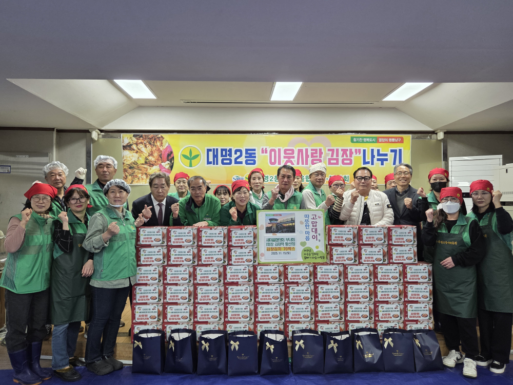 [경북도민방송=손중모기자] 대구 남구 대명2동 새마을협의회·부녀회는 지난 15일 대명2동 행정복지센터 별관에서 저소득 세대 등 어려운 이웃을 위한 ‘사랑의 김장 나눔 행사’를 진행했다.이날 회원들은 이른 아침부터 정성껏 김장을 담그며 관내 취약계층의 겨울 식탁을 돕기 위해 손을 모았다. 완성된 김장김치는 대명2동 행정복지센터를 통해 저소득 가정 70세대에 전달됐다.황선희 부녀회장은 “김치를 전달하는 행사에 그치지 않고 어려움을 함께 나누고 힘이 되고 싶다는 마음으로 준비했다”며“정성이 담긴 마음이 이웃들에게 따뜻하게 전해지길 바란다”고 말했다.