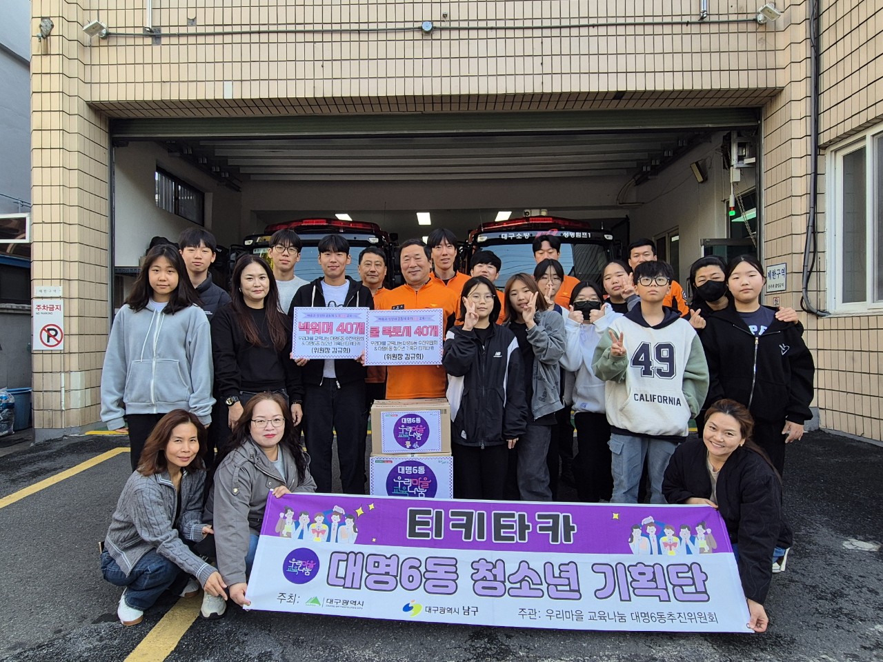 한 청소년은 “추운 날씨에도 위험한 현장에서 일하시는 소방관 아저씨들께 조금이나마 도움이 되고 싶었다”고 말했다.김규희 우리마을 교육나눔 대명6동 추진위원장은 “청소년과 주민들이 함께 소방관들에게 감사의 뜻을 전할 수 있어 의미가 깊다”고 했다.소방서 관계자는 “청소년들이 직접 필요 물품을 알아보고 준비해 준 점이 특히 고맙다”며 “현장에서 안전을 지키는 데 잘 쓰겠다”고 말했다.대명6동은 이번 기부 활동이 지역사회 연대감을 높이고 청소년들의 사회적 책임 의식을 확장시키는 계기가 됐다고 설명했다.