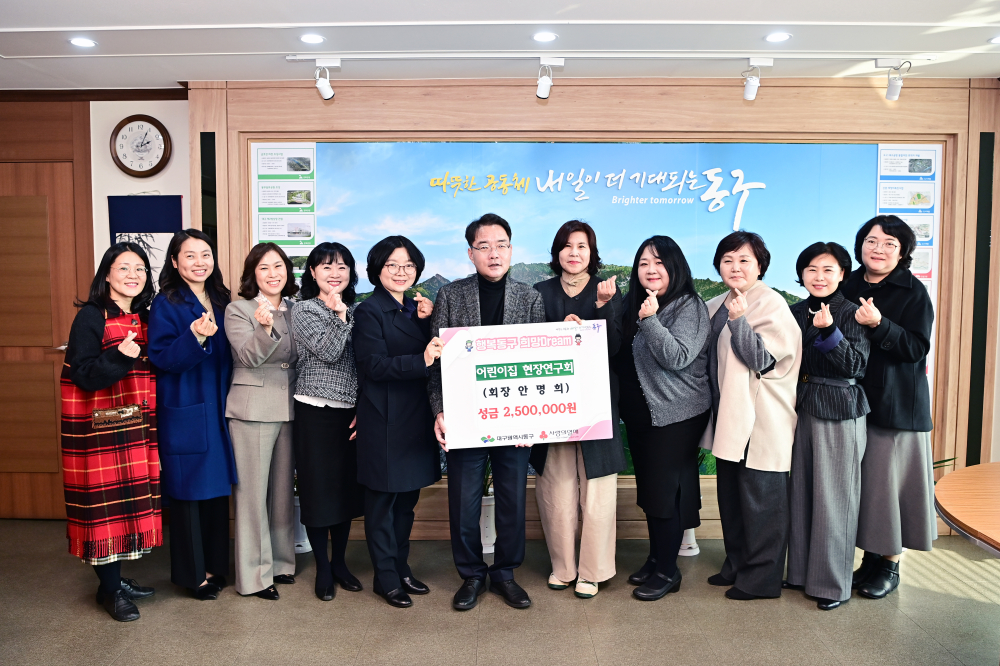 [경북도민방송=손중모기자] 대구 동구 어린이집 현장연구회가 지난 25일 둔산동 옻골마을에서 열린 플리마켓 행사 수익금 250만원을 동구청에 기탁했다.어린이집 현장연구회는 국공립 어린이집 10개소가 참여한 교육·학습 공동체로, 영유아의 건강한 성장을 돕고 지역사회 나눔을 실천하기 위해 매년 다양한 활동을 이어오고 있다.안명희 회장은 “플리마켓을 통해 나눔의 가치를 직접 체험하는 뜻깊은 시간이었다”며 “앞으로도 지역 이웃을 돕는 따뜻한 공동체 활동을 꾸준히 이어가겠다”고 말했다.윤석준 동구청장은 “회원들의 따뜻한 마음에 감사드리며, 소중한 성금은 어려운 이웃을 위해 의미 있게 사용하겠다”고 밝혔다.