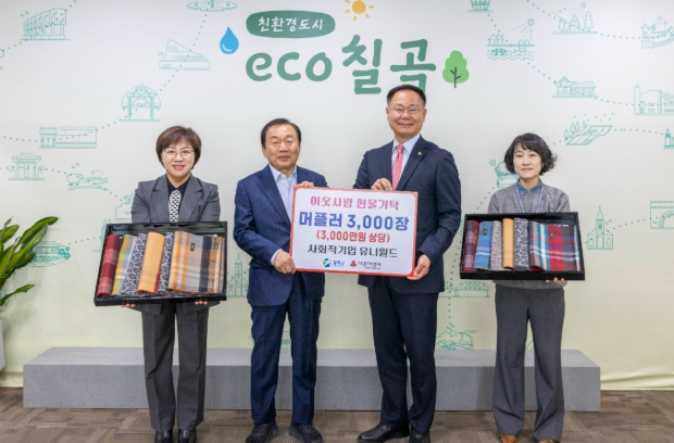 [경북도민방송=한동균 기자] 사회적 기업 유니월드(대표 최장희)에서 지난 24일 월요일 겨울을 맞아 겨울 머플러 3,000개(3,000만원 상당)을 관내 어려운 이웃을 위해 써달라며 기탁 했다. 유니월드는 대구시 동구 소재의 섬유제품회사 서도산업(대표 한재권)의 자회사로 16년 부터 머플러를 기부하여 누적기부액 4천만원으로 나눔문화 확산에 앞장서고 있다. 김재욱 칠곡군수는 “어려운 경기 상황 속에서도 추운 겨울을 맞아 취약계층을 위해 따뜻한 마음을 모아주셔서 감사드립니다. 소중한 기부의 뜻이 잘 전달 될 수 있도록 노력하겠다” 라고 전했다.