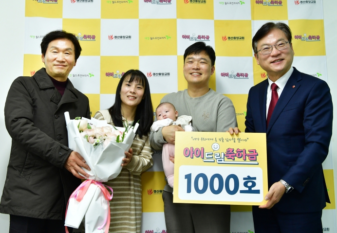 [경북도민방송=이종환 기자]경산시는 2일 경산중앙교회 내 대경월드휴먼브리지 사무실에서‘아이드림축하금 1,000호 대상자 탄생 축하 기념행사’를 가졌다. 아이드림축하금 지원사업은 경산시가 지난해 7월 경산중앙교회, 대경월드휴먼브리지(대표 김종원)와 체결한 ‘저출생 극복 및 가족친화적 환경 조성을 위한 업무협약’에 따라 추진되고 있는 민관 협력 출산 축하 사업으로, 초기 양육 부담 경감 및 출생 친화적 분위기 조성을 목표로 시행되고 있다.업무협약에 따라 대경월드휴먼브리지는 2024년 9월 1일부터 경산시에 주소를 둔 출생 신생아에게 1인당 20만원의 아이드림축하금을 지원해왔으며, 이날 기준 지원 아동이 1,000명을 돌파했다. 아이드림축하금은 단순한 금전적 지원을 넘어 “지역사회 모두가 아기의 탄생을 함께 축하한다”는 의미를 담고 있다. 또한 양육 정보를 나누고 정서적 지지를 함께함으로써, 출산과 양육에 대한 긍정적 인식을 확산시키는 데 중요한 역할을 하고 있다.조현일 경산시장은 “민관이 저출생 극복을 위해 한뜻으로 추진해 온 아이드림축하금이 1,000호를 맞이한 것은 매우 의미 있는 일”이라며 “앞으로도 시민들의 출산·양육 지원 정책을 더욱 촘촘히 보완해 아이와 부모 모두가 행복한 경산을 만드는 데 최선을 다하겠다”고 말했다.