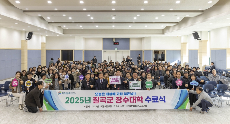 [경북도민방송=한동균 기자]‘2025년 칠곡군 장수대학 수료식’이 12월 4일 오전10시 칠곡군 교육문화회관에서 성황리에 개최됐다. 이번 수료식에는 칠곡군 장수대학 수강생 200여 명이 참석해 1년동안 진행한 배움의 여정을 마무리했으며, 칠곡군수를 비롯한 지역 주요 내빈들도 함께해 축하의 의미를 더했다. 칠곡군 장수대학은 지역 어르신들에게 평생학습의 기회를 제공하기 위해 운영되는 대표적인 교육 프로그램으로, 문화·예술·건강·교양·IT 등 다양한 분야의 강좌를 통해 어르신들의 삶의 질 향상과 사회참여 활성화를 지원해왔다. 이번 수료식에서는 공식 행사와 함께 수강생들이 사물놀이 등의 식전공연을 진행하고, 직접 완성한 서예·사군자·늘배움학교 작품을 전시하는 전시회가 열려 참석자들의 큰 호응을 받았다. 어르신들의 정성과 열정이 담긴 작품들은 칠곡군 장수대학의 배움의 성과를 한눈에 보여주는 결과물이었다. 또한 수료식 이후에는 어르신들이 일상생활에서 바로 활용할 수 있는 정보를 제공하기 위한 ‘어르신 경제 특강’이 진행되어 노후생활에 도움이 되는 유익한 시간으로 채워졌다. 김재욱 칠곡군수는 “장수대학은 어르신들의 배움에 대한 열정을 실현하는 공간이자 삶의 활력을 더하는 소중한 프로그램”이라며 “앞으로도 다양한 어르신 특화 강좌를 발굴하여 더 많은 어르신들이 건강하고 활기찬 노년을 보낼 수 있도록 노력하겠다”고 밝혔다.