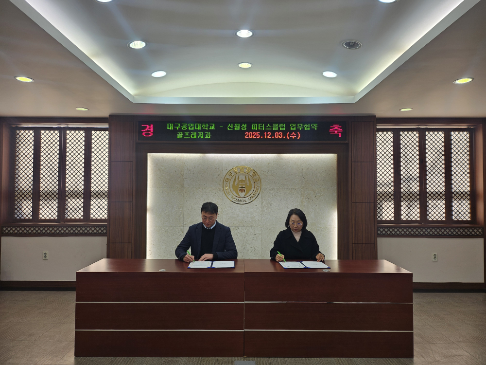 [경북도민방송=손중모기자] 대구공업대학교는 3일 본교에서 골프레저과와 피터스클럽 신월성점간에 학과 맞춤형 활동과 상호 발전을 위한 공동업무협약을 체결했다.