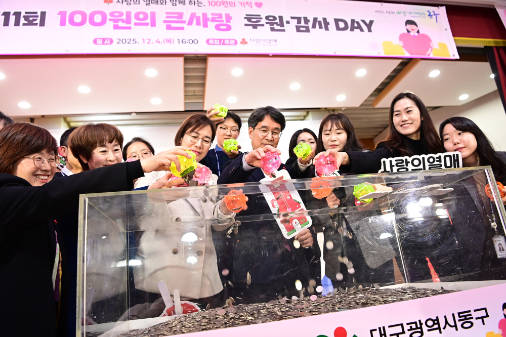 [경북도민방송=손중모기자] 대구 동구만의 기부·나눔 문화 확산 운동인 ‘100원의 큰사랑 후원의 날’ 행사가 4일 동구청에서 열렸다.‘100원의 큰사랑 나눔 운동’은 대구사회복지공동모금회와 함께 2014년 시작된 기부 캠페인으로, 일상에서 모은 100원짜리 동전을 꾸준히 기부하는 나눔 실천 프로그램이다. 올해로 11회째를 맞았다.행사에는 주민, 전통시장 상인회, 각급 위원회, 봉사단체 등이 참석해 지역 소외계층을 위한 온정을 전했다.지난 10년간 이 운동을 통해 모금된 금액은 5억 3천여만 원에 달한다. 모금액은 ‘행복동구 희망Dream’ 사업을 통해 난방비 지원, 명절 나눔, 청소년 학습비 등 15개 복지사업에 사용되며 지역 저소득계층의 생활 안정에 기여하고 있다.윤석준 동구청장은 “어려운 상황 속에서도 마음을 모아 참여해 주신 주민들께 감사드린다”며 “100원의 큰사랑이 동구의 대표 나눔문화로 자리잡은 만큼, 주민의 정성이 실효성 있는 복지로 이어지도록 더욱 촘촘한 사회안전망을 구축하겠다”고 말했다.