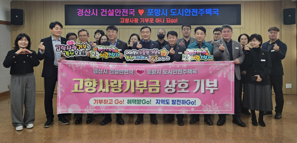 [경북도민방송=이종환기자] 경산시는 9일 경산시 건설안전국 직원과 포항시 도시안전주택국 직원들이 총 700만 원의 고향사랑기부금을 서로 기부하며 연말 고향사랑기부 분위기 확산에 나섰다고 밝혔다.이번 상호기부는 연말을 맞아 지역 간 상생을 도모하고 고향사랑기부제를 다시 환기하고자 마련된 것으로, 양 도시 직원들은 서로의 지역을 응원하는 뜻을 담아 기부에 동참했다.