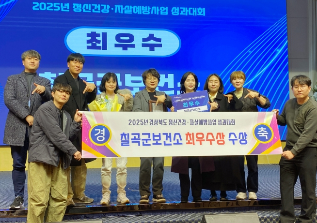 [경북도민방송=한동균 기자] 칠곡군은 지난 8일 구미 호텔금오산에서 열린 ‘2025년 경상북도 정신건강·자살예방사업 성과대회’에서 “최우수상”을 수상했다. 도내 24개 시·군보건소를 대상으로 정신건강사업, 자살예방사업, 우수사업 및 도정협력 등 4개 영역 30개 항목을 평가했으며, 특히 통합예술치유 프로그램 ‘마음, 색(色)으로 피어나다’가 우수사례로 선정됐다. 통합예술치유 프로그램은 음악과 예술, 자연을 매개로 한 예술적 활동으로정신질환자들이 자신과 타인, 환경과의 조화로운 관계를 회복할 수 있도록 진행한 프로그램으로 이번 평가에서 높은 점수를 받았다. 칠곡군은 더욱더 정신질환자의 회복지원을 위해 다양한 프로그램을 제공하여 손상된 사회적응능력을 회복하고 지역사회 복귀를 돕는 서비스를 제공하는데 앞장서도록 할 것이다. 김미영 칠곡군보건소장은 “정신질환자들이 사회와 소통할 수 있는 프로그램을 지속적으로 지원할 수 있도록 노력하고, 지역주민의 정신건강증진과 생명존중문화 확산을 위해 노력하겠다.”고 말했다.