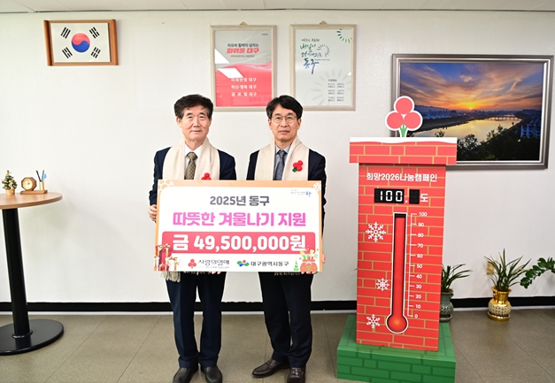 [경북도민방송=손중모 기자]대구사회복지공동모금회(회장 신홍식)는 지난 8일 동구청을 방문해 ‘사랑의 열매달기 릴레이’ 행사를 진행하고, 따뜻한 겨울나기를 위한 성금 4,950만원을 전달했다. 이번에 전달된 성금은 동구 지역 내 저소득층 495세대에 10만원씩 지원됐다. 신홍식 회장은 “매년 따뜻한 나눔에 함께해 주시는 분들께 깊이 감사드린다”며 “올해도 이 캠페인이 많은 분들에게 희망의 불씨가 되길 바란다”고 했다. 윤석준 동구청장은 “대구사회복지공동모금회에서 보내주신 따뜻한 정성에 감사드린다”며 “동구의 취약계층이 따뜻한 겨울을 보낼 수 있도록 소중한 성금을 잘 전달하겠다”고 말했다. 한편, ‘사랑의 열매달기 릴레이’는 지역 명사를 방문해 사랑의 열매 배지를 전달하며, 연말연시 나눔문화를 확산하기 위해 매년 진행되는 캠페인이다.