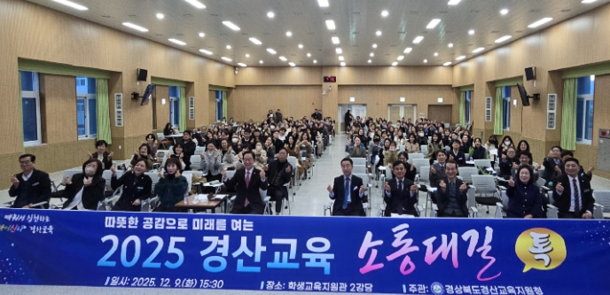 [경북도민방송=이종환 기자]경상북도경산교육지원청은 12월 9일 경산교육지원청 학생교육지원관 2강당에서 경산시장 및 도의회 의원, 관내 유․초․중․고등학교 교(원)장, 학교운영위원장, 학부모회장, 녹색어머니회, 학생상담자원봉사자, 주민감사관 및 공약이행단 대표, 교육계 원로 등 경산 교육가족 220여 명을 초청하여 ‘교육감과 함께하는 2025 경산교육 소통대길 톡’을 개최했다. 이번 ‘2025 경산교육 소통대길 톡’은 디지털 기기를 활용하여 질문과 답변을 제공했으며, 교육 현장의 다양한 의견을 경북교육 정책에 반영하고 학교 현장 지원을 강화하기 위한 따뜻한 공감의 값진 시간으로 이루어졌다. 주요업무보고에서는 경산교육지원청의 학교 지원 실적과 업무 경감‧교육 환경 개선 실적을 보고했다. 교육감과 대화 시간은 토론회 시작 전에 참석자들이 경북교육의 정책과 방향, 경북교육에 바라는 점, 교육 현안에 대해 현장에서 질문하고 즉석에서 교육감이 대답하는 방식으로 진행됐다. 임종식 교육감님의 세계교육의 표준인 경북교육에 대한 자부심과 참석자들의 경북교육에 대한 애정 어린 관심으로 열띤 소통과 토론이 펼쳐졌다. 임종식 교육감은 “경산교육 가족을 모시고 소통과 공감의 시간을 가지게 되어 의미 있게 생각한다. 학생들과 교육 현장을 최우선에 두고, 모두가 존중받는 따뜻한 경북교육 실현을 위해 최선을 다할 것”이라고 밝혔다. 정수권 교육장은“지역의 현안과 교육 가족들의 목소리를 교육감과 공유하여 다양한 방안을 모색할 수 있어 지역교육생태계 활성화에 큰 도움이 됐다.”고 말했다.