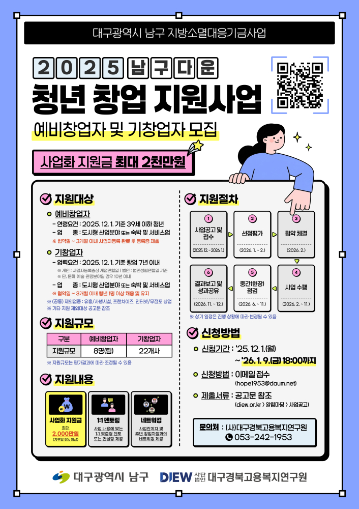 특히 지역 특화산업과 연계한 창업을 유도해 남구 산업 구조에 맞는 새로운 비즈니스 모델 발굴이 기대되고 있다.신청은 전자우편을 통해 가능하며, 자세한 모집 요강은 남구청 홈페이지 또는 (사)대구경북고용복지연구원에서 확인할 수 있다.조재구 남구청장은 “청년들의 창의적 비즈니스가 지역경제에 새로운 활력을 불어넣고 있다”며 “앞으로도 청년이 남구에서 도전하고 성장할 수 있도록 다양한 창업 지원을 이어가겠다”고 말했다.