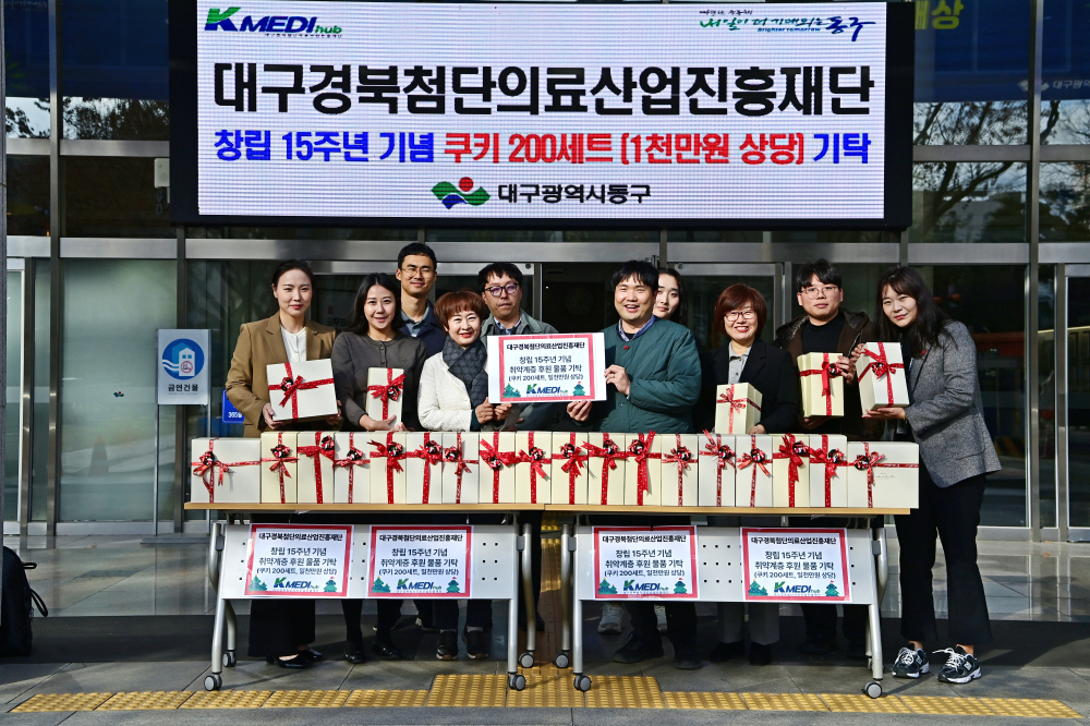 [경북도민방송=손중모기자] 대구경북첨단의료산업진흥재단이 창립 15주년을 맞아 지난 12일 지역 내 어려움을 겪고 있는 대구 동구 저소득 가정을 위해 쿠키 200상자(1천만 원 상당)를 동구청에 기탁했다.이번 기탁은 창립기념일을 맞아 지역사회와 상생하는 나눔을 실천하기 위해 마련됐으며, 전달된 쿠키는 동구청을 통해 관내 취약계층 가정에 전달될 예정이다.박구선 이사장은 “창립 15주년을 맞아 지역사회와 함께 의미 있는 나눔을 실천할 수 있어 더욱 뜻깊다”며 “정성을 담아 준비한 쿠키가 겨울을 앞두고 어려움을 겪는 이웃들에게 작은 힘이 되길 바란다”고 말했다.윤석준 동구청장은 “창립기념일을 맞아 지역을 위한 따뜻한 나눔을 실천해 준 재단 관계자들께 감사드린다”며 “기탁된 물품은 도움이 필요한 저소득 가정에 소중히 전달하겠다”고 밝혔다.한편 대구경북첨단의료산업진흥재단은 지난 9월에도 명절을 맞아 성수품과 생필품을 동구청에 기탁하는 등 지역사회 공헌 활동을 꾸준히 이어오고 있다.
