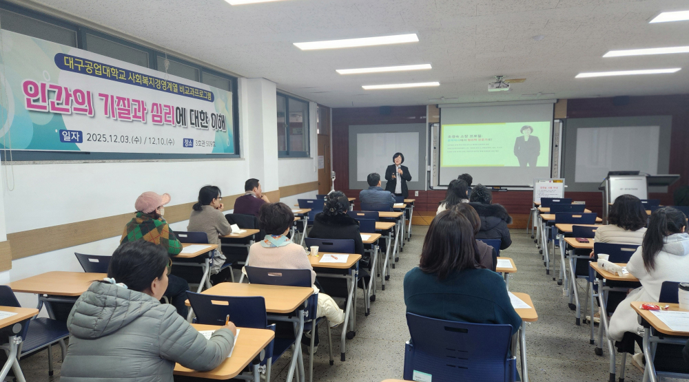 [경북도민방송=손중모기자] 대구공업대학교 사회복지경영계열은 지난 3일과 10일 두 차례에 걸쳐 성인학습자를 대상으로 인간의 기질과 심리에 대한 이해를 주제로 한 비교과 프로그램을 운영했다고16일 밝혔다.이번 프로그램은 성인학습자들이 자신의 기질과 심리적 특성을 이해하고, 이를 바탕으로 사회복지 현장에서의 역할 수행과 대인관계 역량을 강화할 수 있도록 돕기 위해 마련됐다.강연은 조경숙 윤오명리아카데미 소장이 맡아 인간의 기질 이해를 비롯해 오행 성향에 따른 사회복지 진로·적성 매칭, 오행 기반 인간관계 및 소통 전략 등을 중심으로 실제 사례를 곁들여 진행됐다.프로그램에 참여한 한 재학생은 “자신의 성향과 기질을 객관적으로 돌아볼 수 있는 의미 있는 시간이었다”며 “사회복지 현장에서 다양한 사람들과 소통하는 데 필요한 방향을 설정하는 데 도움이 됐다”고 말했다.이선교 사회복지경영계열장은 “사회복지는 이론과 기술 습득뿐 아니라 자기 이해의 과정이 함께 이뤄져야 하는 분야”라며 “이번 비교과 프로그램이 학생들이 자신의 강점을 발견하고 현장에 강한 전문 사회복지사로 성장하는 계기가 되길 바란다”고 밝혔다.