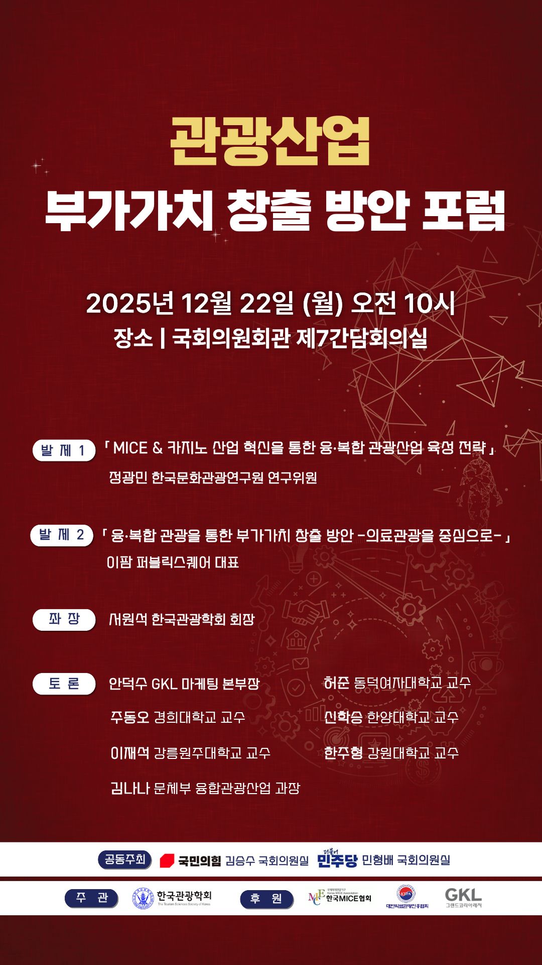 토론에서는 융·복합 관광 활성화를 위한 정책 방향과 제도 개선 과제를 중심으로 심도 있는 논의가 이뤄질 계획이다.최근 K-컬처 확산과 함께 방한 외래 관광객 수는 꾸준히 증가하고 있으나, 관광 소비의 수도권 집중과 단순 체류형 관광 구조로 인해 관광산업의 질적 성장에는 한계가 있다는 지적이 제기돼 왔다.