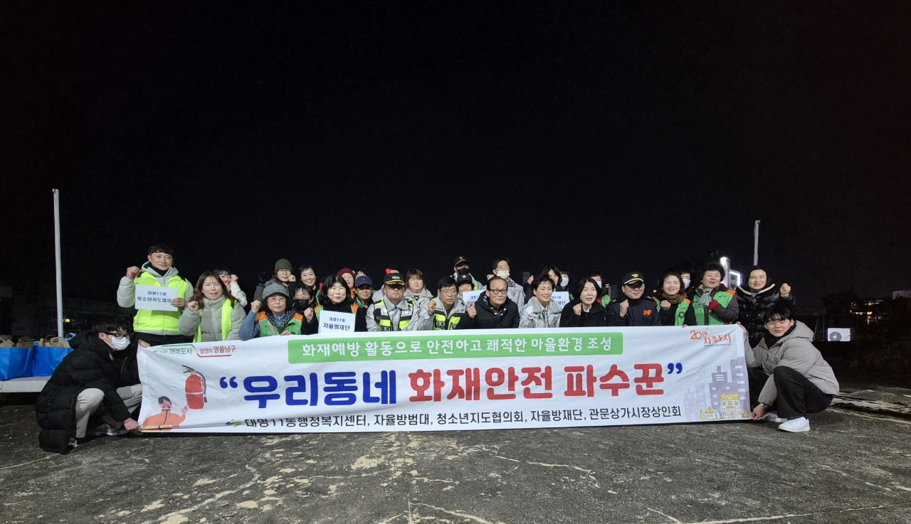 [경북도민방송=손중모기자] 대구 남구 대명11동 행정복지센터는 지난 15일 오후 7시 지역 주민과 유관 단체가 함께 참여하는 ‘우리동네 화재안전 파수꾼’ 캠페인을 실시하며 안전하고 쾌적한 마을 환경 조성에 나섰다.이번 캠페인은 최근 관문시장 인근에서 발생한 화재 사고를 계기로 주민들의 안전 의식을 높이고, 주거 밀집 지역과 전통시장의 화재 위험 요소를 사전에 점검·차단하기 위해 마련됐다.캠페인에는 자율방범대, 청소년지도협의회, 자율방재단으로 구성된 ‘우리동네 화재안전 파수꾼’ 회원 40여 명이 참여했으며, 관문상가시장상인회와 성명119안전센터가 함께 동절기 화재 예방 활동을 전개했다.