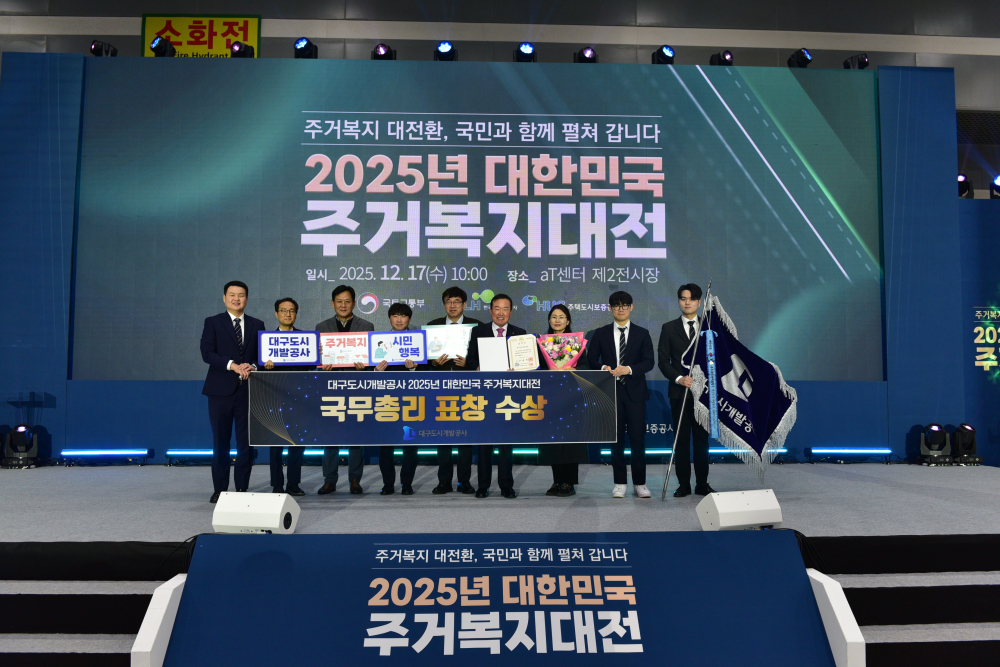 [경북도민방송=이종환기자] 대구도시개발공사는 지난 17일 서울 양재 AT센터에서 열린 대한민국 주거복지대전에서 주거복지 정책 추진 성과를 인정받아 국무총리표창을 수상했다고 밝혔다.대한민국 주거복지대전은 국토교통부가 주최하는 행사로, 주거복지 분야에서 우수한 정책과 성과를 거둔 기관을 선정해 포상하고 있다.