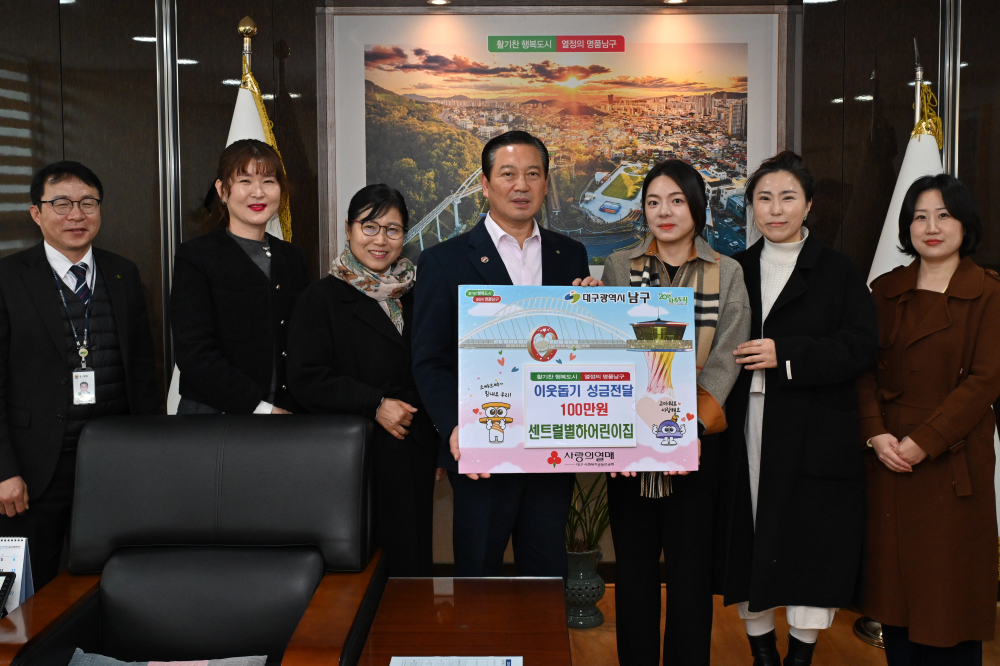 [경북도민방송=손중모기자] 국공립 센트럴별하어린이집은 지난 10일 남구청을 방문해 어린이집에서 진행한 ‘작은손 큰나눔 모금함’ 행사를 통해 모금한 성금을 전달했다.‘작은손 큰나눔 모금함’ 행사는 아이들이 일상 속에서 나눔의 가치를 자연스럽게 배우고 직접 실천해보는 체험형 교육 프로그램으로, 행사 기간 동안 모인 성금은 연말을 맞아 어려운 이웃을 돕는 데 사용될 예정이다.이번 나눔은 어린이집 원아들을 비롯해 보육 교직원과 학부모가 함께 참여해 의미를 더했으며, 아이들에게는 나눔과 배려의 중요성을 몸소 느낄 수 있는 계기가 됐다는 평가다.이현숙 국공립 센트럴별하어린이집 원장은 “추운 겨울을 보내고 있는 취약계층 이웃들이 어린 손으로 모은 작은 정성으로 조금이나마 따뜻한 겨울을 보내길 바란다”고 전했다.조재구 남구청장은 “뜻깊은 행사에 함께해 준 보육 교직원과 학부모, 어린이들에게 감사의 마음을 전한다”며 “앞으로도 이 나라의 미래인 어린이들이 따뜻한 마음과 나눔의 가치를 지닌 시민으로 성장하길 바란다”고 말했다.