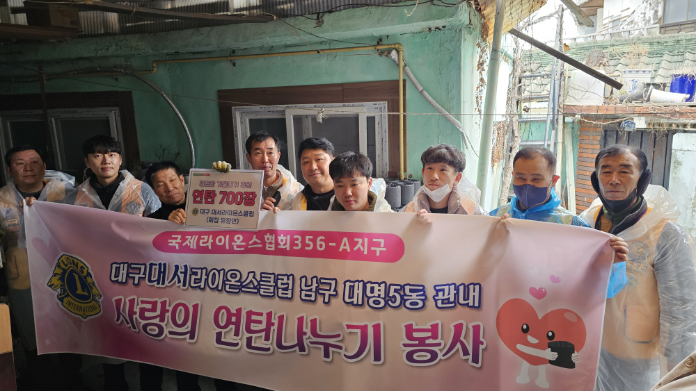 [경북도민방송=손중모기자] 대서라이온스클럽은 지난 16일 대구 남구 대명5동에서 겨울철 난방에 어려움을 겪는 취약계층을 돕기 위해 ‘사랑의 연탄나눔’ 봉사활동을 펼쳤다.이번 봉사활동은 회원들의 자발적인 참여로 진행됐으며, 지역 내 취약계층 4세대를 대상으로 총 700장의 연탄을 후원했다.