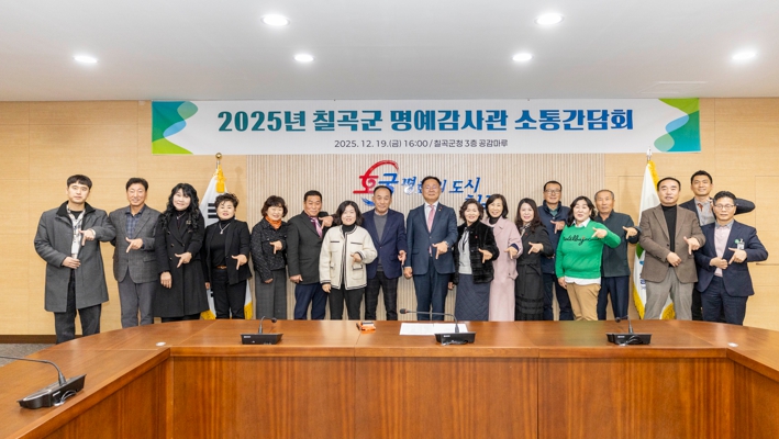 [경북도민방송=한동균 기자]칠곡군은 지난 19일 군청 3층 공감마루에서 군민이 참여하는 열린 감사체계를 강화하고, 현장의 다양한 의견을 군정에 반영하기 위해 2025년 칠곡군 명예감사관 소통간담회를 개최했다.이날 간담회는 기획감사실장, 청렴감사팀장, 칠곡군 명예감사관 등이 참석한 가운데, `군수 인사말`, `명예감사관 제도 안내`, `2026년도 운영계획 보고`, 읍면별 현안 논의 및 건의사항` 순으로 진행됐다.칠곡군 명예감사관 제도는 2008년 제1기를 시작으로 현재 제8기 명예감사관 19명이 활동 중이며, 명예감사관은 생활 현장의 위법 부당 사항 제보, 안전 취약지역 발굴, 공무원 비위행위 신고 등 군정 전반에 대한 제보와 건의 등의 역할을 수행하고 있다.김재욱 칠곡군수는 인사말을 통해 “바쁜 일정 속에서도 군민과 행정을 잇는 가교 역할을 해주고 계신 명예감사관 여러분께 감사드린다.”며, “앞으로도 현장의 목소리를 적극 반영해 공정하고 투명한 칠곡군정을 만들어 가겠다”고 말했다.