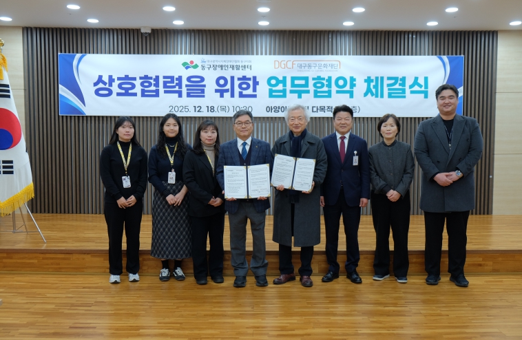 [경북도민방송=손중모 기자](재)대구동구문화재단(이사장 윤석준)과 동구장애인재활센터(센터장 이종근)는 지난 12월 18일, 지역 장애인의 건강증진과 생활체육 활성화를 위한 업무협약(MOU)을 체결했다.이번 협약은 지역사회 내 사회적 약자의 문화·체육 접근성을 확대하고, 장애인의 건강한 여가문화 형성을 지원하기 위한 양 기관의 공동 의지를 바탕으로 마련됐다. 향후 두 기관은 ▲생활체육 프로그램 공동 기획·운영 ▲인적·물적 자원 교류 ▲공동 캠페인 및 홍보 활동 등 다양한 협력 사업을 추진할 예정이다.대구동구문화재단은 지역 문화·체육 인프라를 기반으로 장애인의 생활체육 참여 기회 확대를 위해 다각적인 지원 방안을 지속적으로 검토해 왔으며, 동구장애인재활센터는 지역 장애인을 대상으로 재활·건강증진·여가·교육문화 프로그램을 운영하며 자립과 사회참여를 돕고 있다. 이에 따라 양 기관의 MOU를 통해 보다 실질적인 협력 효과가 기대된다.대구동구문화재단 최영은 상임이사는 “이번 협약이 지역 장애인의 건강한 삶을 위한 실질적인 지원체계를 구축하는 중요한 계기”라며 “차별 없는 문화와 체육을 누릴 수 있는 지역 환경 조성에 최선을 다하겠다”라고 밝혔다.동구장애인재활센터 이종근 센터장은 “생활체육은 장애인의 신체 기능 향상뿐 아니라 자존감 회복과 사회참여에도 중대한 역할을 한다”며 “이번 협력을 통해 더 많은 장애인이 체육 활동에 참여할 수 있기를 바란다”고 전했다.양 기관은 이번 협약을 시작으로 장애인의 건강증진 프로그램 확대, 전문 강사 배치, 지역사회 참여 확대 등 지속 가능한 협력 체계를 구축해 나갈 계획이다.