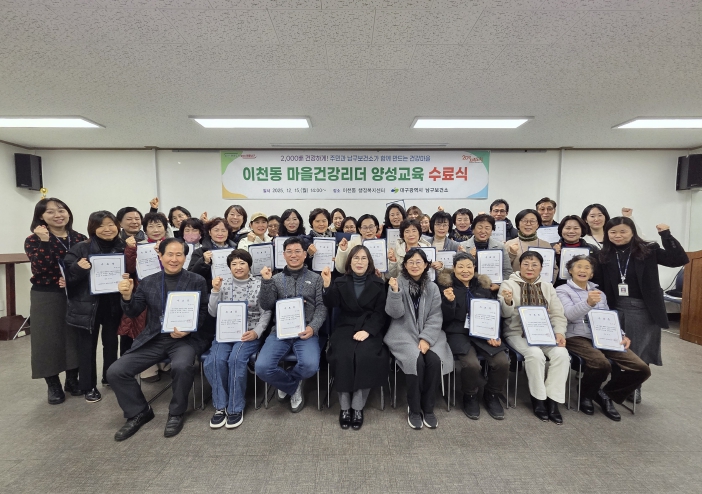 [경북도민방송=손중모 기자]대구 남구는 지난 15일 건강마을 조성을 위한 ‘건강리더 양성교육’을 성공적으로 마무리했다고 밝혔다.남구보건소는 올해부터 추진 중인 이천동 건강마을 만들기 사업의 원활한 운영을 위해 지난 1년간 주민 대상 홍보활동을 이어왔으며, 이번 교육은 마을 건강증진 활동의 핵심 역할을 맡을 건강리더를 양성하기 위해 기획됐다.이번 교육에는 이천동 주민 30여 명이 참여했으며, 지난 11월부터 7주간 총 10회차에 걸쳐 진행됐다.